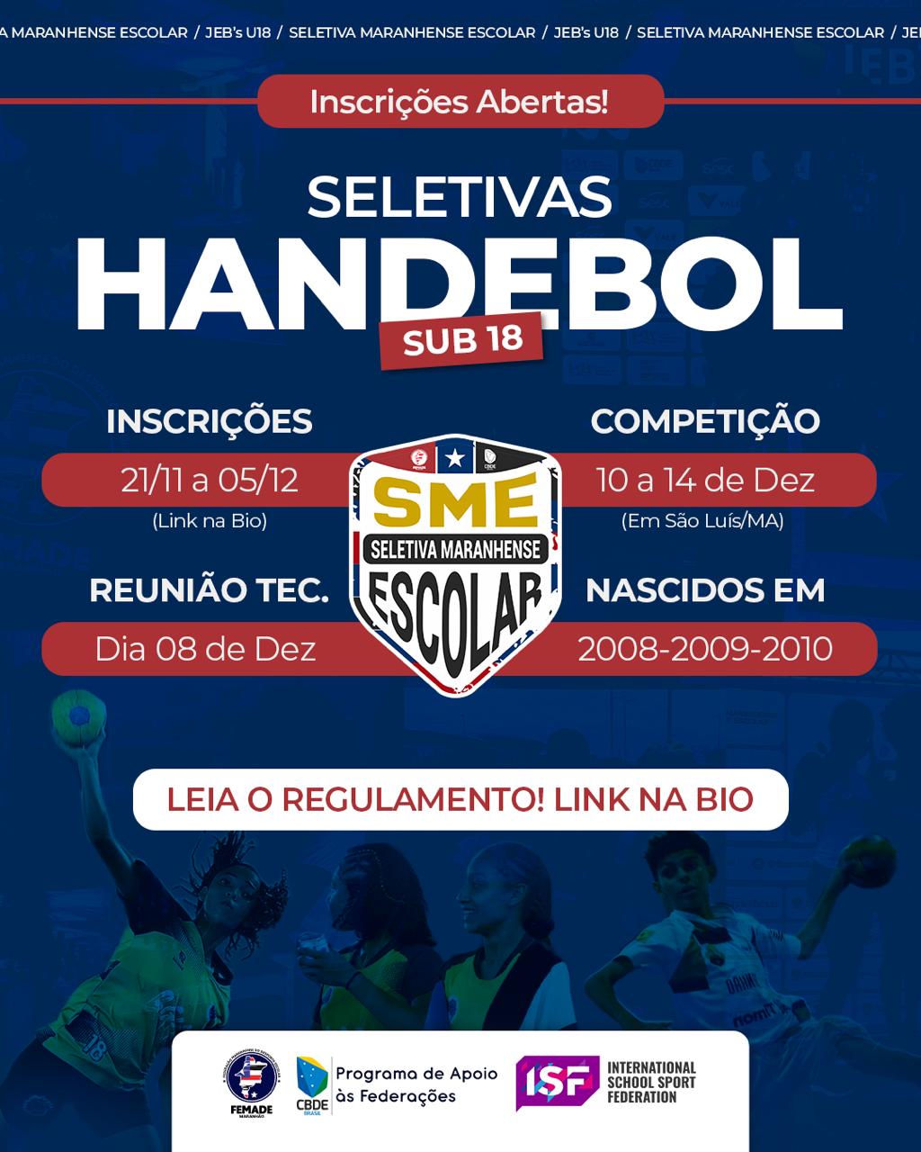 A Federação Maranhense do Desporto Escolar (FEMADE) anuncia que estão abertas as inscrições para a Seletiva Maranhense Escolar de Handebol Sub-18, que irá definir os representantes do Maranhão no JEBs Sub-18 em abril de 2026.
