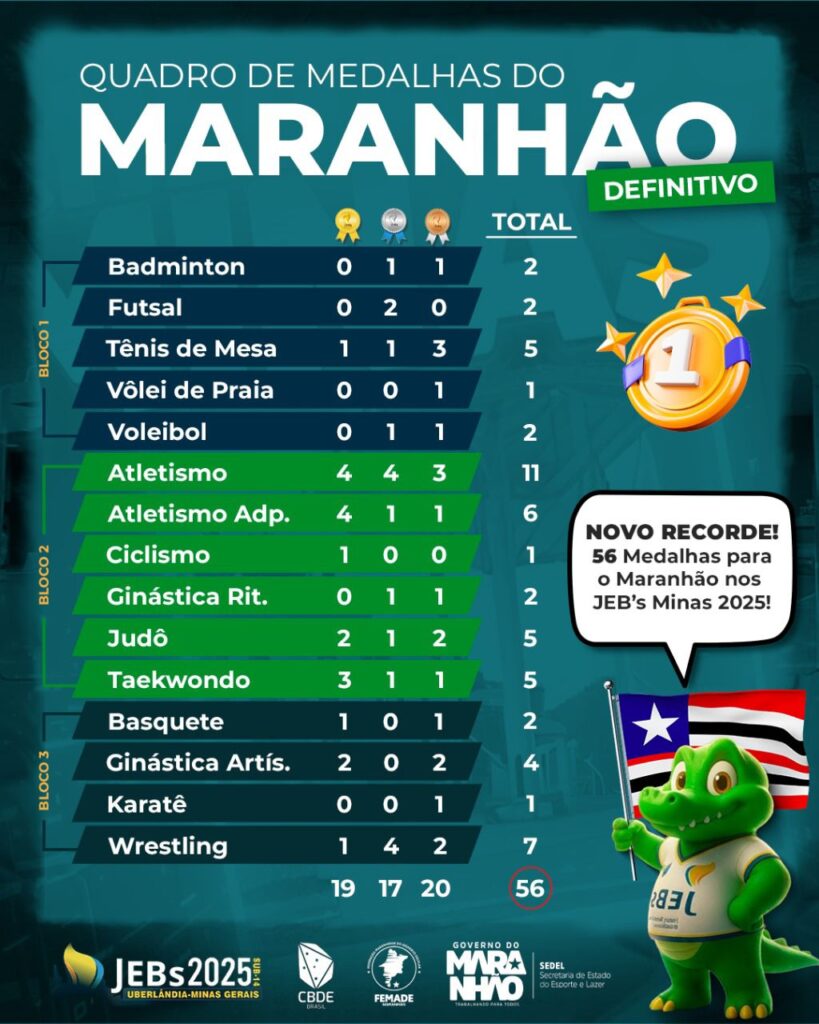 A delegação maranhense encerrou sua participação nos Jogos Escolares Brasileiros (JEBs 2025), realizados em Uberlândia (MG), com um desempenho histórico. Foram 56 medalhas no total, sendo 19 de ouro, 17 de prata e 20 de bronze, o maior número já conquistado pelo Maranhão em uma edição dos JEBs.